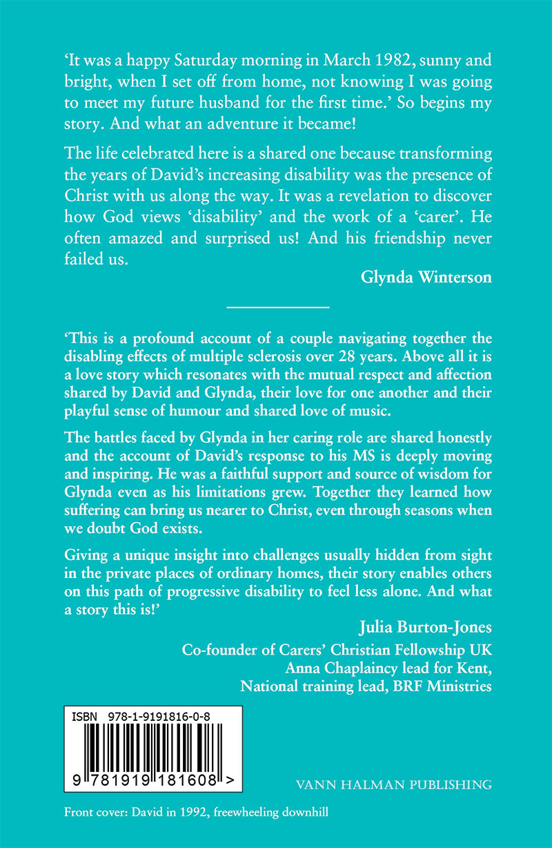 For all the struggles and heartache, there is not a hint of self-pity in the book. David’s spirit and faith shine through as he uncomplainingly accepts the increasing limitations brought about by MS – all the time finding strength in his unshakable belief that God loves him and is working His purpose out. And Glynda is at his side throughout. Remarkably, there is much joy and humour in the book. Glynda says it was a privilege to care for David, and her love and dedication never falter. It came as a cost, though, and Glenda does not shy away from it. She tellingly writes in the book: