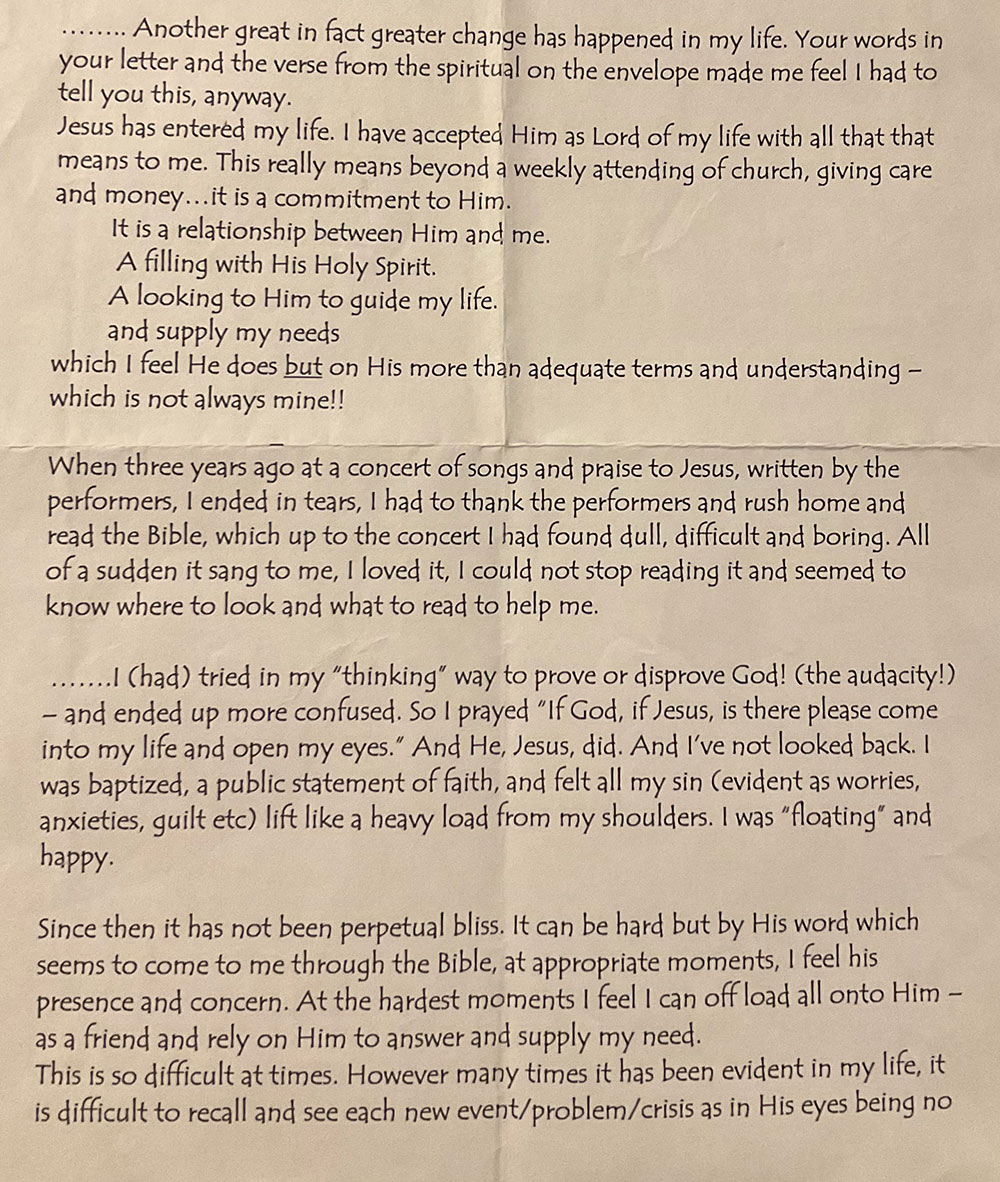 Part of David’s letter to a friend in 1985
