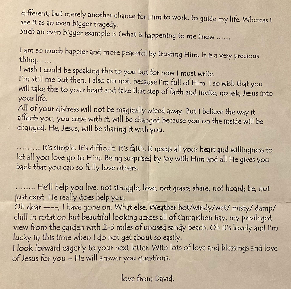One of David’s friends was experiencing difficulties. Although at the time of writing this letter David had very serious health problems and griefs of his own, he hardly touches on these, choosing rather to try and encourage his friend by sharing how coming to faith has helped him.